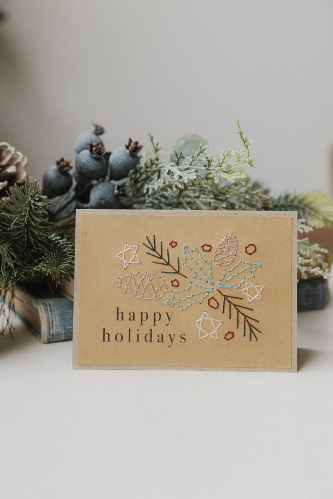 Set of 4 assorted cards that reads "happy holidays" with an assortment of winter berries & foliage.