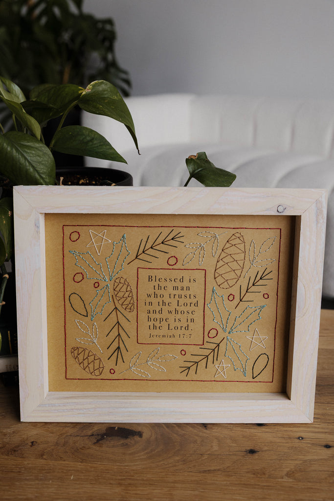 A beautifully stitched sign full of winter foliage, detail & color; stitched with love by our team of mamas in Haiti paired with the scripture: "Blessed is the man who trusts in the Lord and whose hope is in the Lord" - Jeremiah 17:7