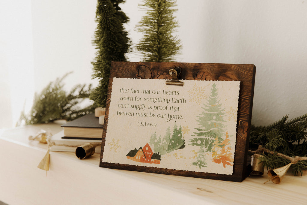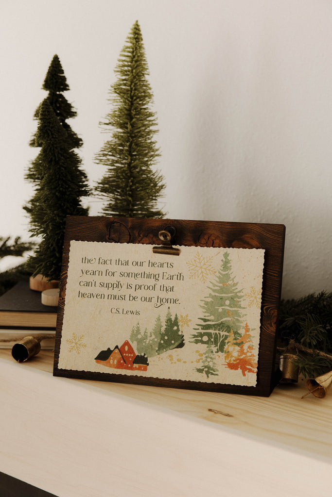 "the fact that our hearts yearn for something Earth can't supply is proof that heaven must be our home." - C.S. Lewis; text is set with a winter landscape featuring trees, snowflakes & red cottage home