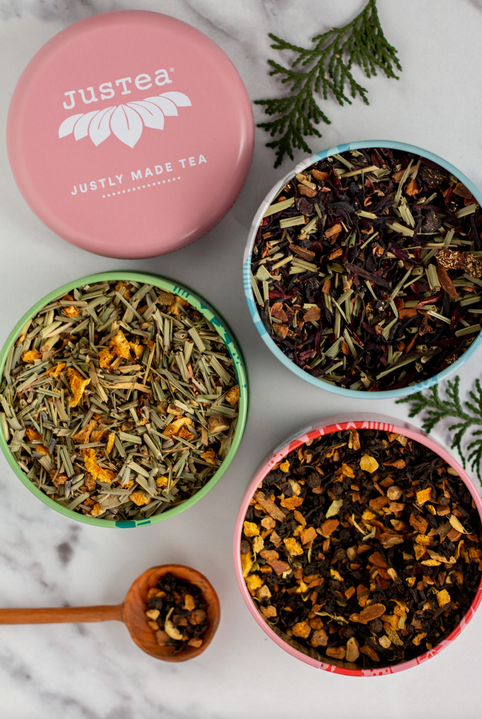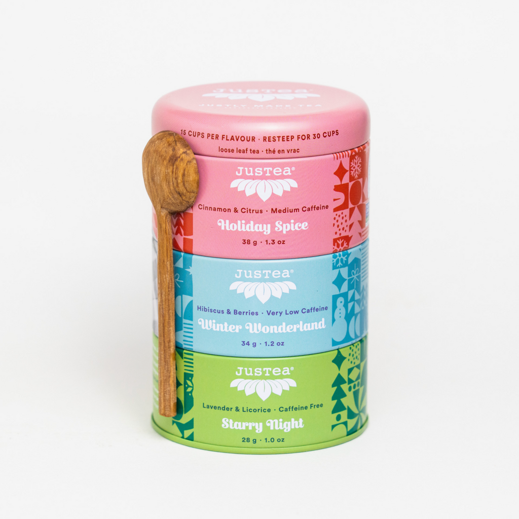 Featuring JusTea's seasonal top seller; you don't want to miss this one! PERFECT GIFT that gives back! 3 FESTIVE FLAVORS: Holiday Spice (medium-caffeine black tea), Winter Wonderland (low-caffeine purple tea), and Starry Night (caffeine-free herbal tea)