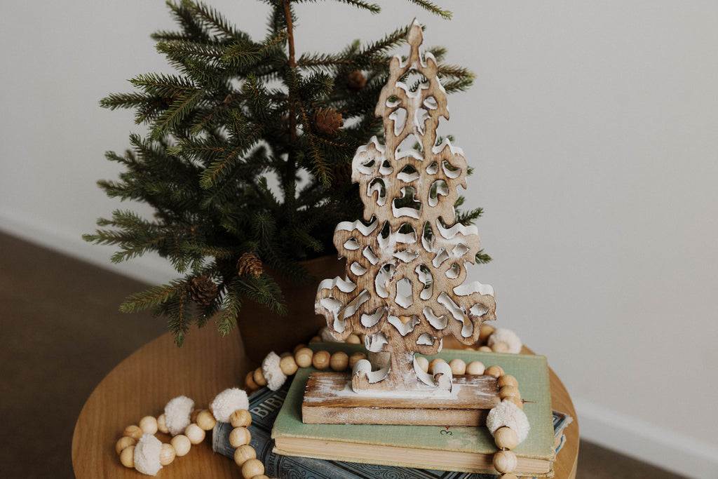 Intricately carved mango wood, the Winter Wonderland Tree is accented with a whitewash that will add all the winter wonderland feels to your holiday décor. Crafted by artisans in India, this truly is a timeless and ethically sourced classic, sure to add charm to your home!
