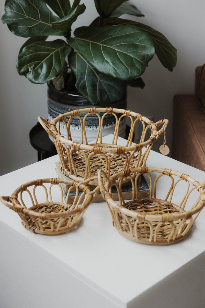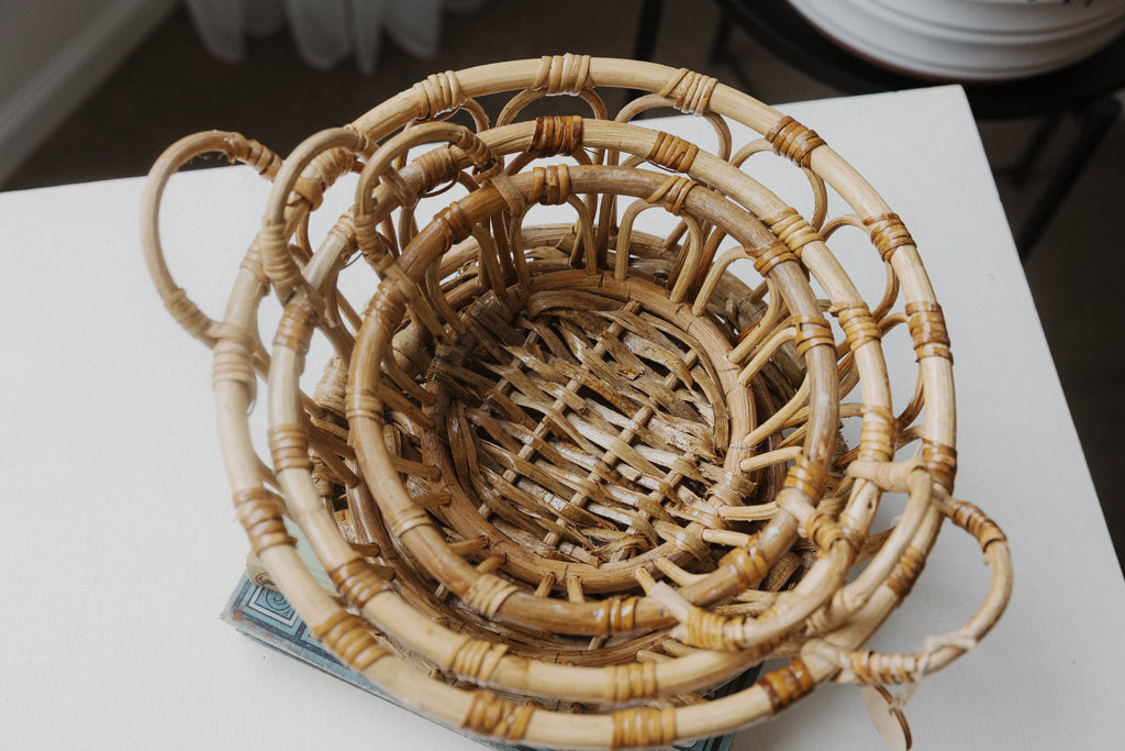 A modern take that utilizes rattan's sturdy yet flowing qualities, this basket set beautifully accents any modern home - whether it be the kitchen or the living room. Each piece is carefully handwoven by artisans in the Philippines.