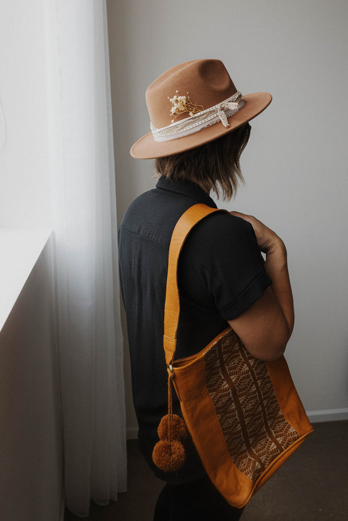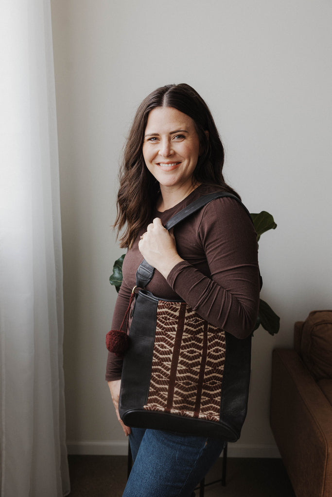 Handwoven textile is complimented with solid leather, allowing for endless styling. Featuring a snap closure and interior pockets for staying organized, this tote comfortably fits a 13-inch laptop along with all other essentials.